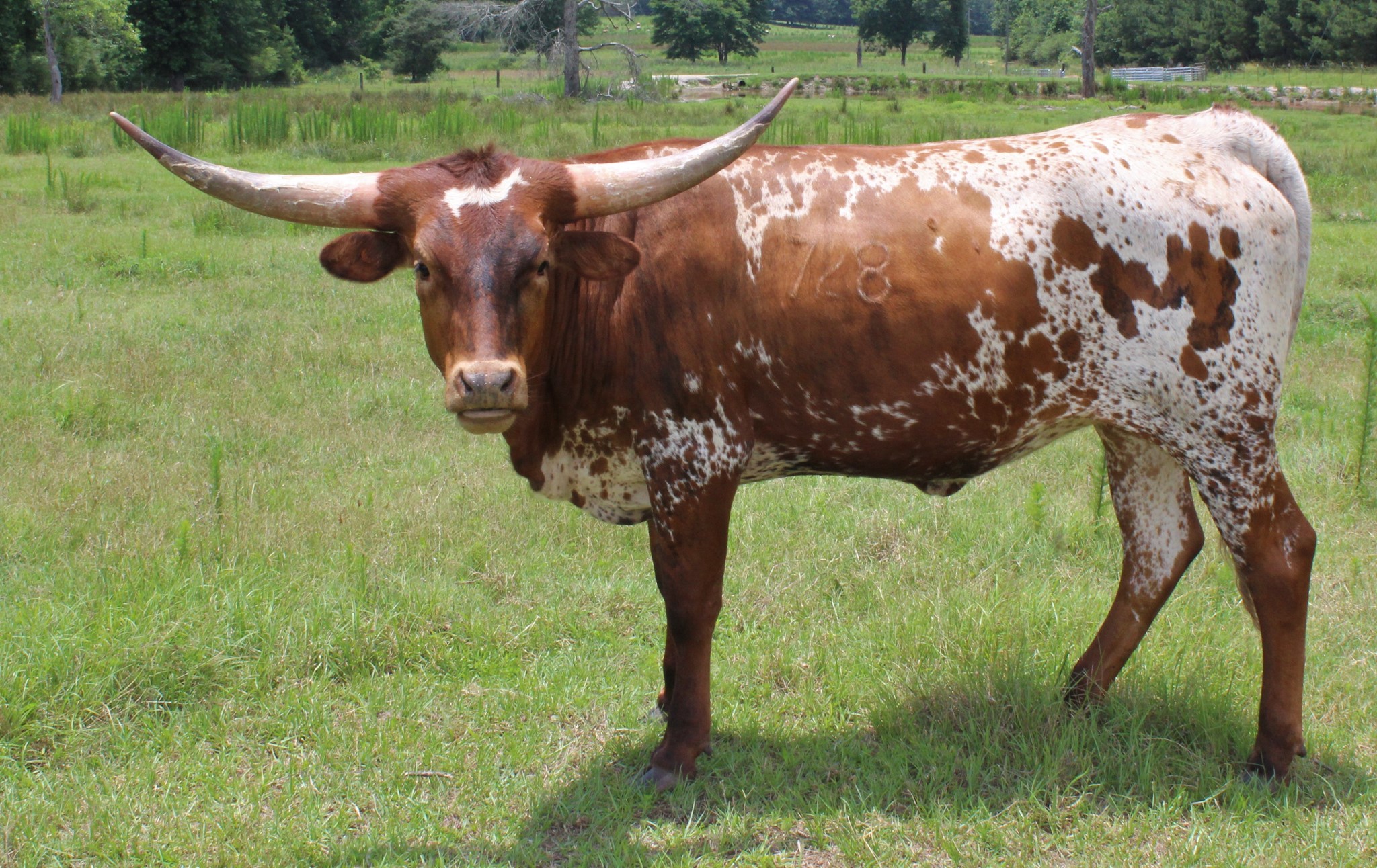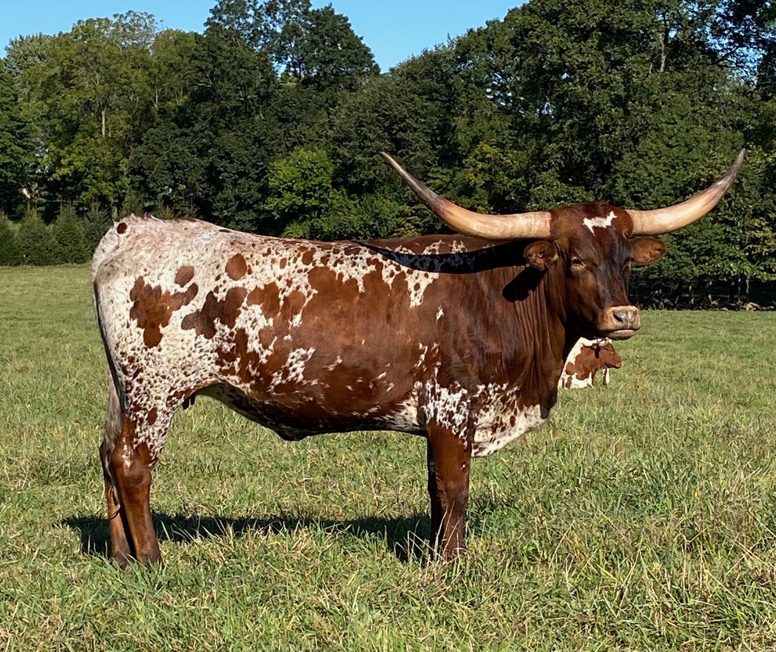 Delilah is an easy keeping, colorful cow who brings together some of the best genetics in the industry with a great mix of bull power and cow power. She has raised two colorful calves out of two seperate bulls and is currently exposed to our Jr Herd Sire Hicks Regulator who is a grandson of WS Hydro, another color throwing rock star. Delilah represents the genius of Nancy Dunn breeding, and the perfect temperament of the Longhorn Breed.