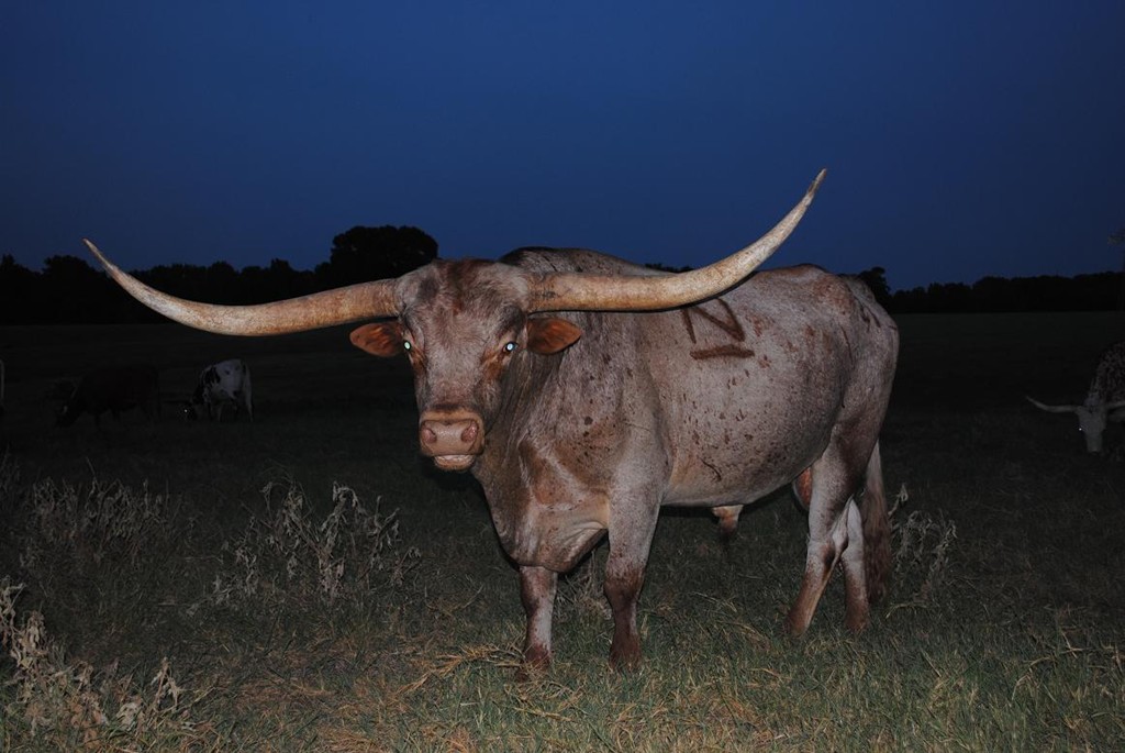 Buzz Saw was co-owned with Red McCombs. He had the same gentle disposition as his grand sire Chuckwagon who we owned. Current horn measurement is 77 ttt. Based on the calves of Ben Gravett and Red McCombs he appears to produce on par with Sittin Bull. We should have 40+ calves to be excited about in 2011/2012.He died in a tragic death while being housed at Sexing Technologies waiting to be collected. This is a great loss.