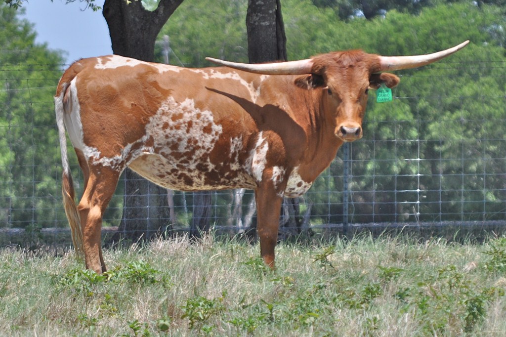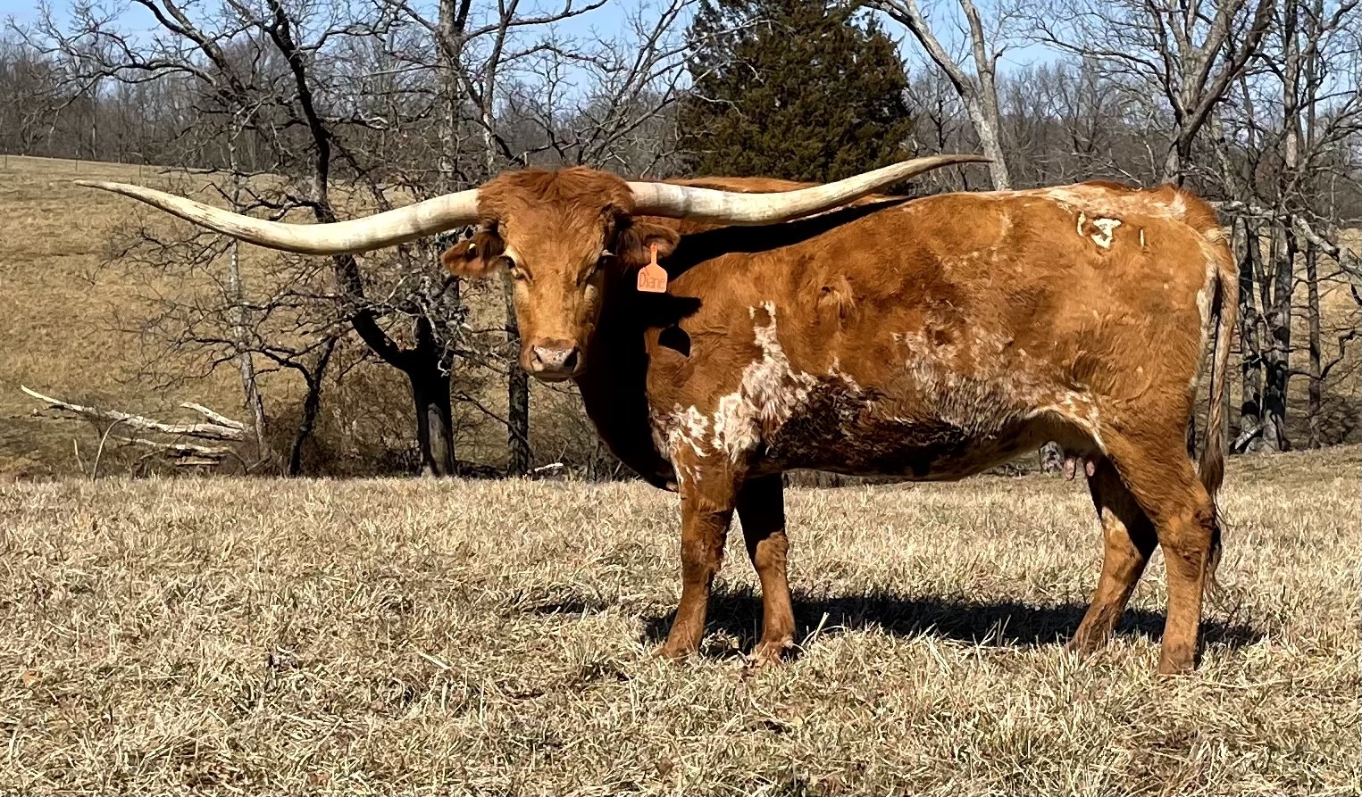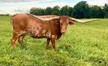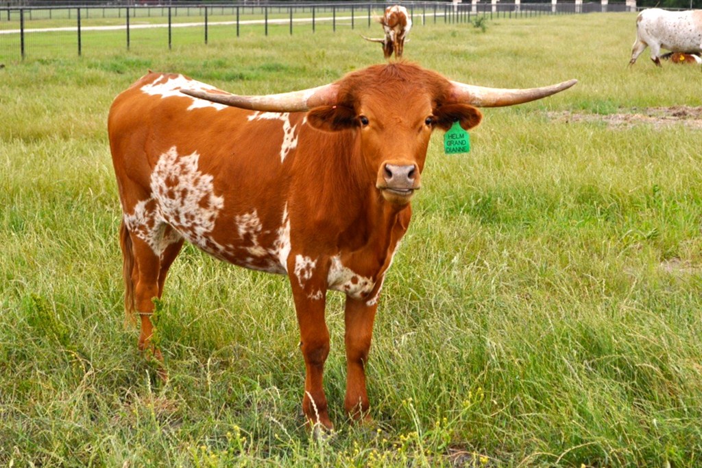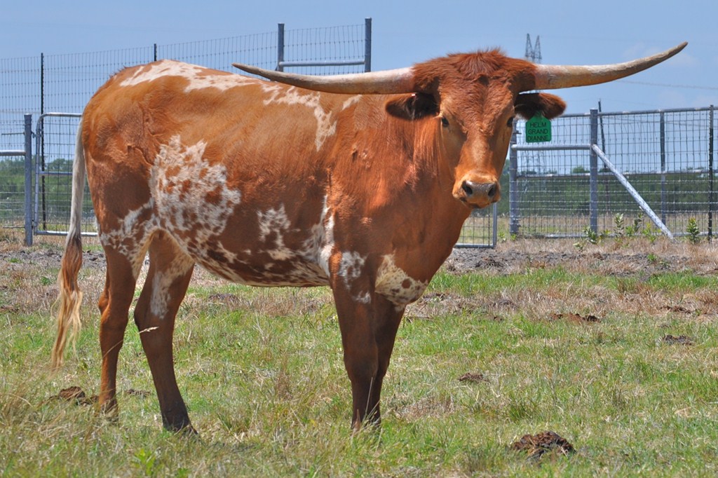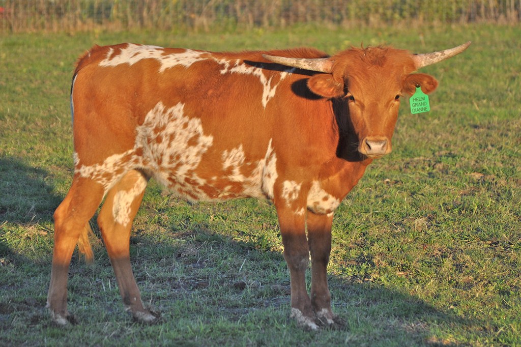 Beautiful young heifer with laid back / lateral horns headed out just the way we like them. Her Dam is the awesome "Hunts Respected Dianne" who is Doug Hunt's favorite cow (named after the First Lady Dianne Hunt ), she has the horn set and length ( 77" + ttt ) that she has passed on to this beautiful heifer. This heifer's sire is a great bull named "Hunts Grand Command" ( 78" + ttt ) who did a great job of passing femininity, conformation, color and horn to his daughters. "Helm Grand Dianne" is confirmed bred to "Hubbells 20 Guage" a young colorful bull ( Concealed Weapon x Hubbells Rio Glory ) who will be one of the great bulls in the industry soon. See him here on our website. The offspring from this paring will be packed full of horn producing 80" x 80" genetics. You will love this girl when you see her and she will be one of the great girls in the breed. Expect spring calf in March 2015 from this exciting paring.