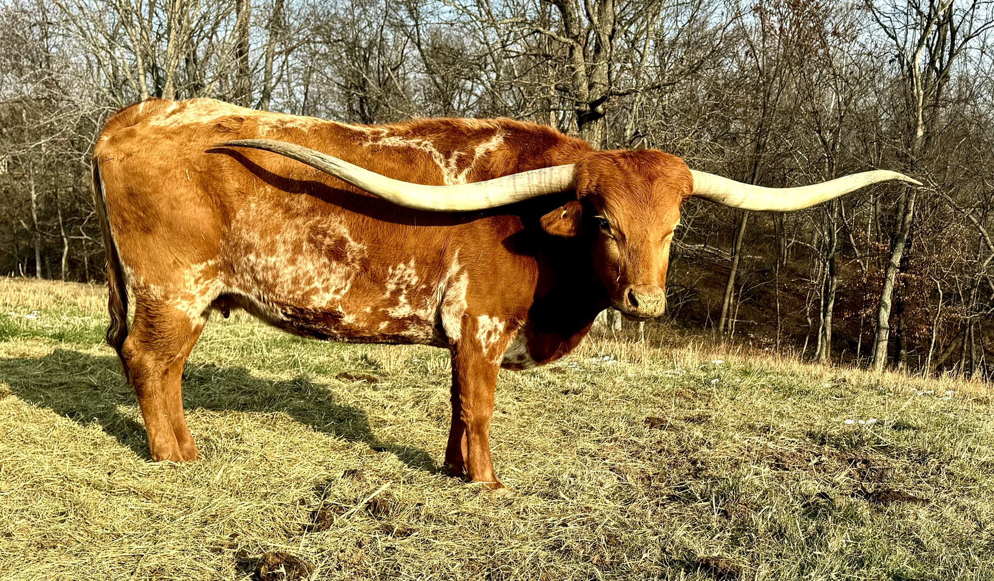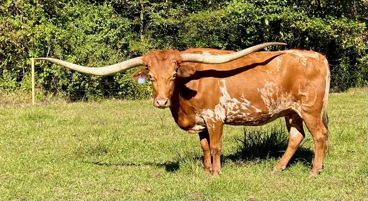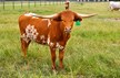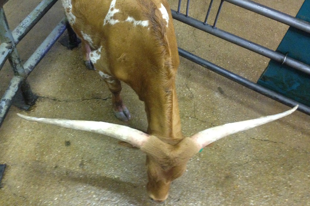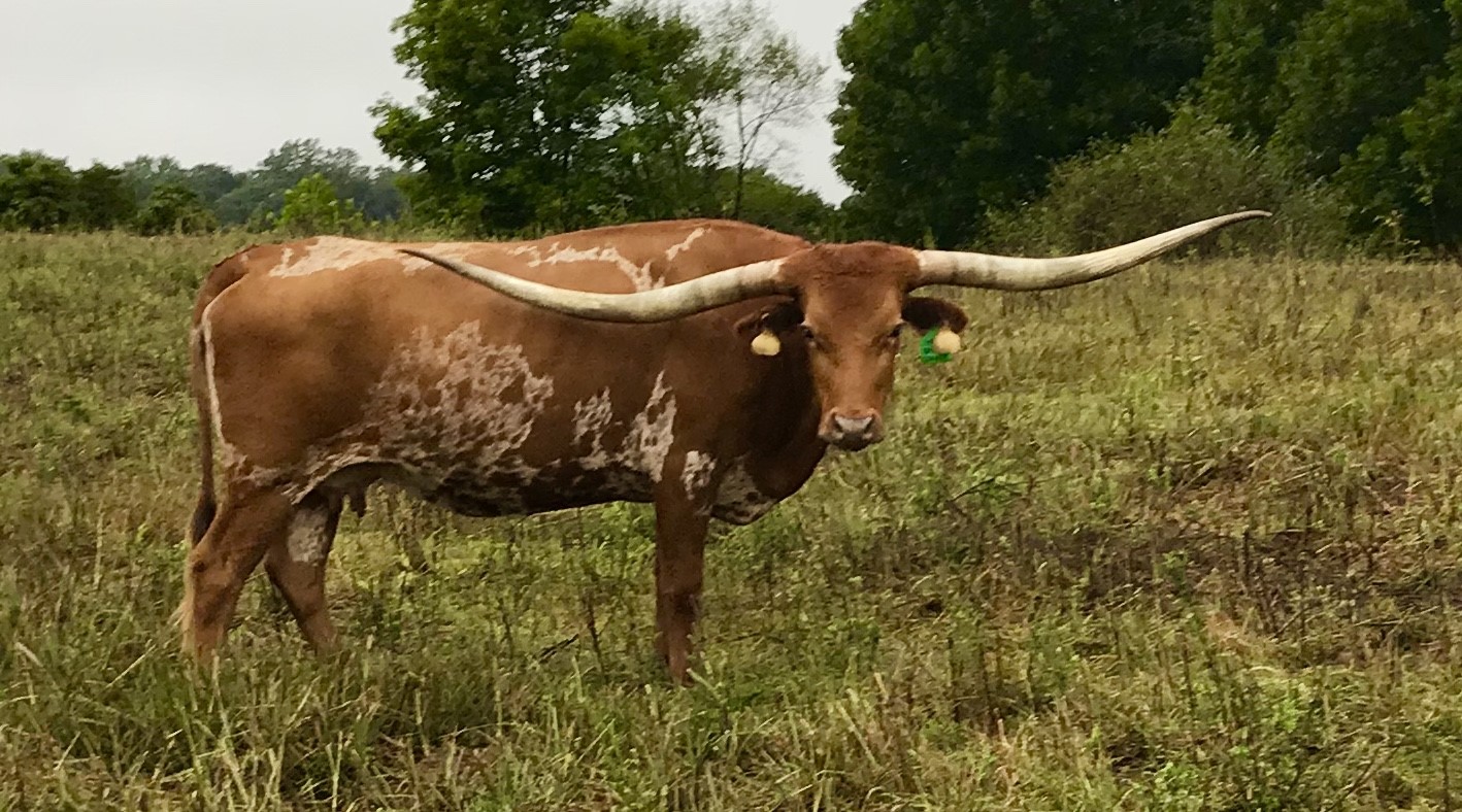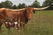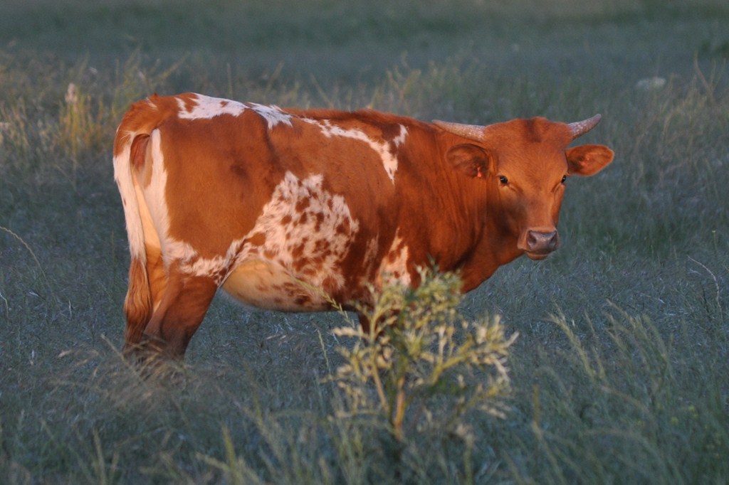 Beautiful young heifer with laid back / lateral horns headed out just the way we like them. Her Dam is the awesome "Hunts Respected Dianne" who is Doug Hunt's favorite cow (named after the First Lady Dianne Hunt ), she has the horn set and length ( 77" + ttt ) that she has passed on to this beautiful heifer. This heifer's sire is a great bull named "Hunts Grand Command" ( 78" + ttt ) who did a great job of passing femininity, conformation, color and horn to his daughters. "Helm Grand Dianne" is confirmed bred to "Hubbells 20 Guage" a young colorful bull ( Concealed Weapon x Hubbells Rio Glory ) who will be one of the great bulls in the industry soon. See him here on our website. The offspring from this paring will be packed full of horn producing 80" x 80" genetics. You will love this girl when you see her and she will be one of the great girls in the breed. Expect spring calf in March 2015 from this exciting paring.