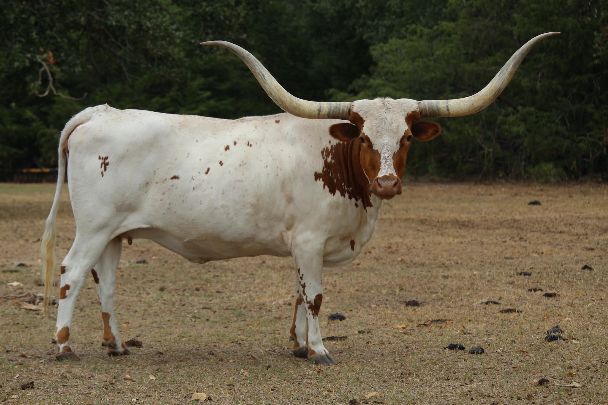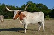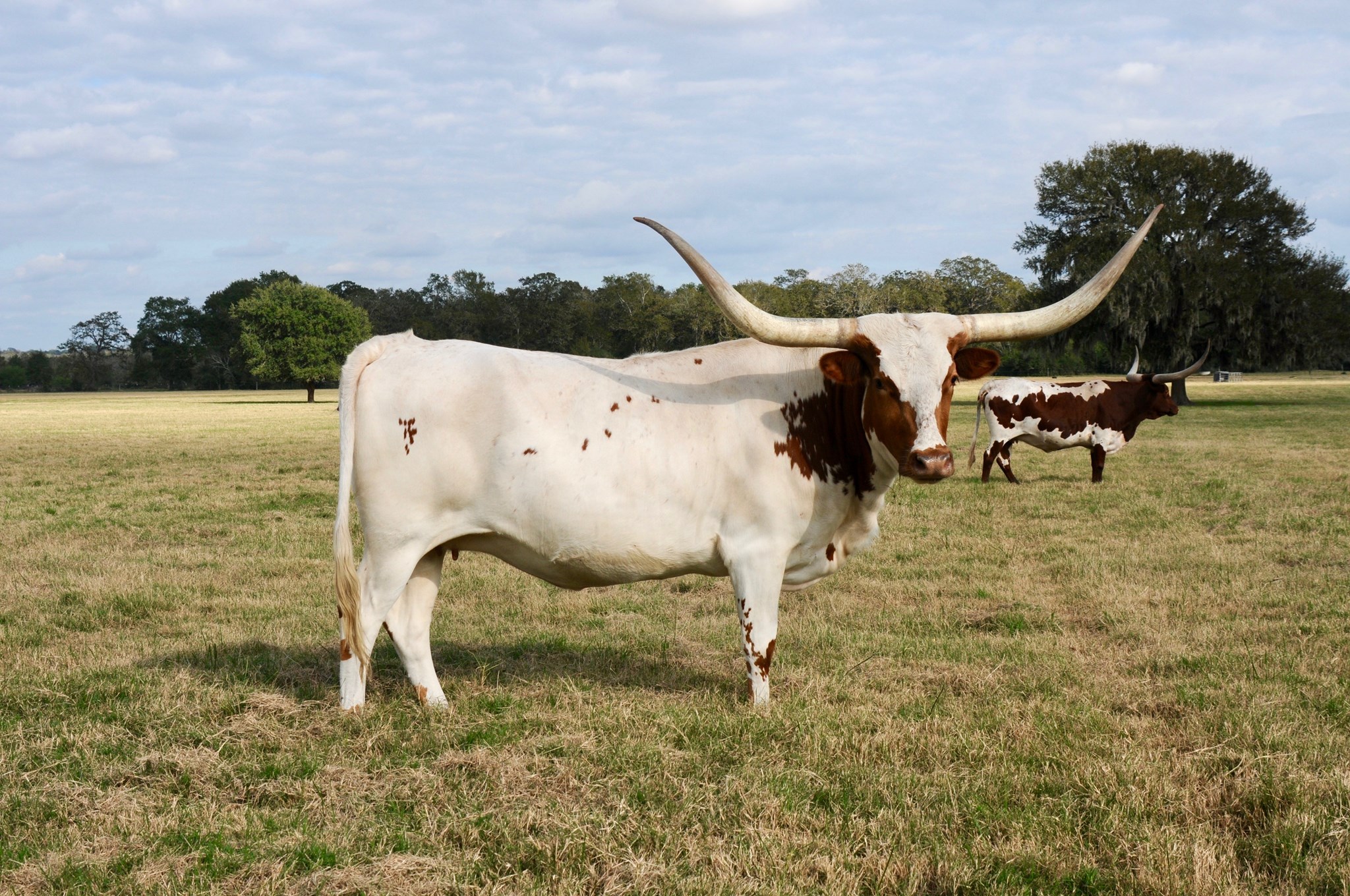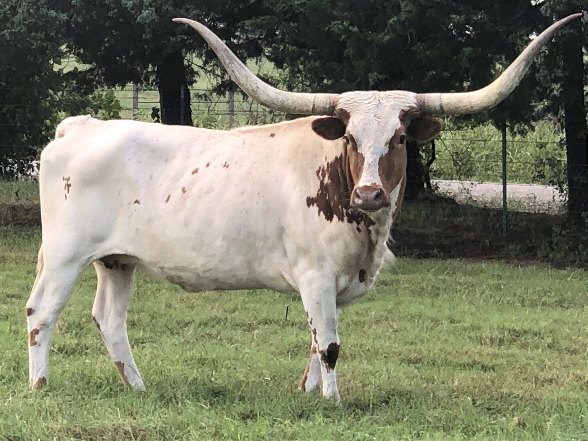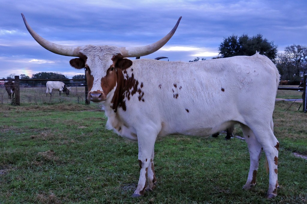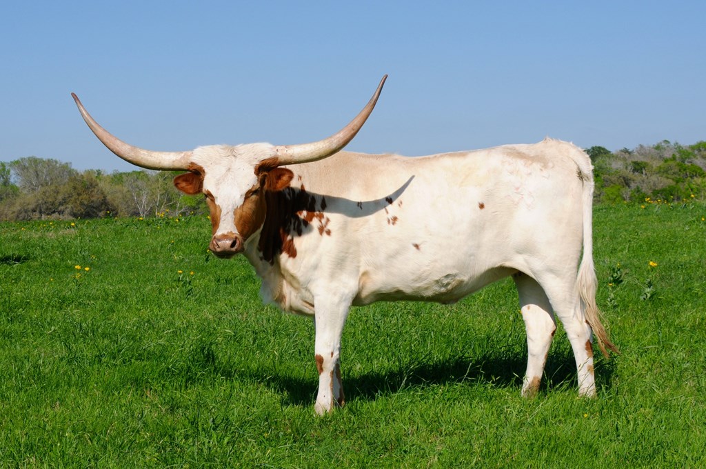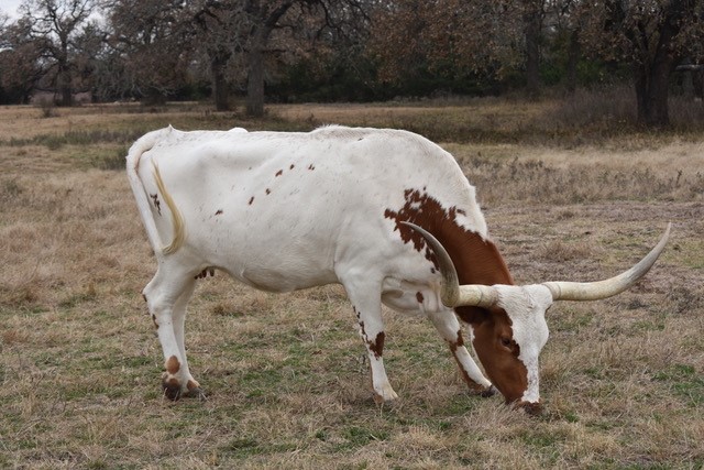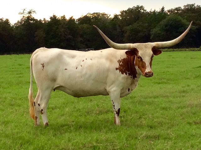 SOLD! Thank you Heath Yates for your purchase. Her name says it all--Elegant! Elegante has been a foundation cow for Ironwood. Her pedigree includes Cowboy Chex and Amazing Grace so you know she has solid bloodlines. She produces correct well structured calves, produces well for her calves from start to weaning and has a very calm disposition. Feet and udder attachment are perfect. Now over 87" in those Texas handlebar style horns. We are retainng her daughter and grand daughters to carry on her lineage. Your chance for a proven producer, gentle momma with good feet, udder and most of all disposition. She just produced another gorgeous heifer out of TCR Royal "T". Pair is available. Exposed to BCR Full House bringing in HL Higher Ground and the 93" Spanish Bloom.